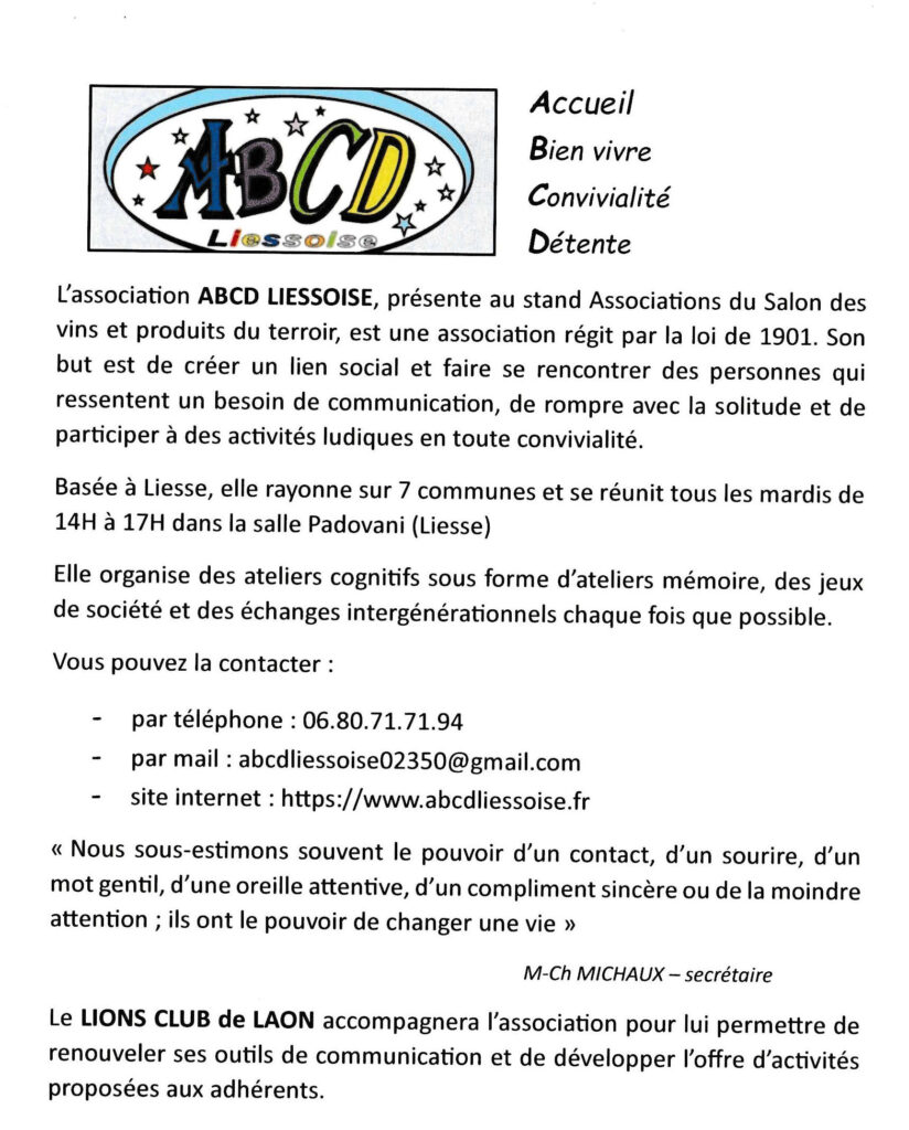 Ci contre : l’article présentant l’association abcdliessoise, paru dans le dépliant distribué aux 2000 visiteurs du salon des vins, organisé le samedi 14 et dimanche 15 mars 2026 au boulodrome de Laon